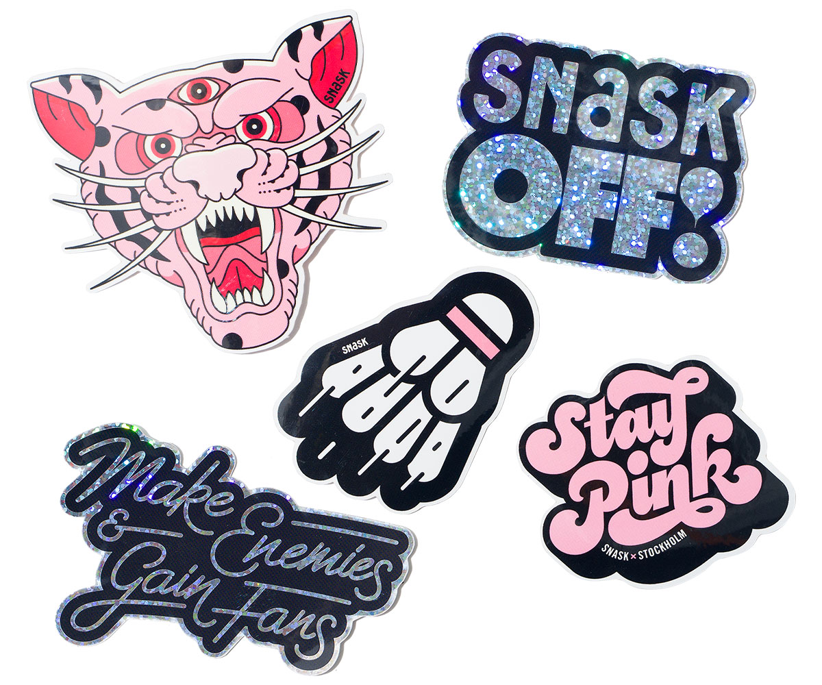 Help us decorate the world with Snask messages like the obvious “Snask Off!”, the we’re all equal statement “Stay Pink” or the stand-up-for-your-beliefs “Make Enemies & Gain Fans”. We’ll throw in the legendary pink tiger as well as the Snask historic badminton ball.
